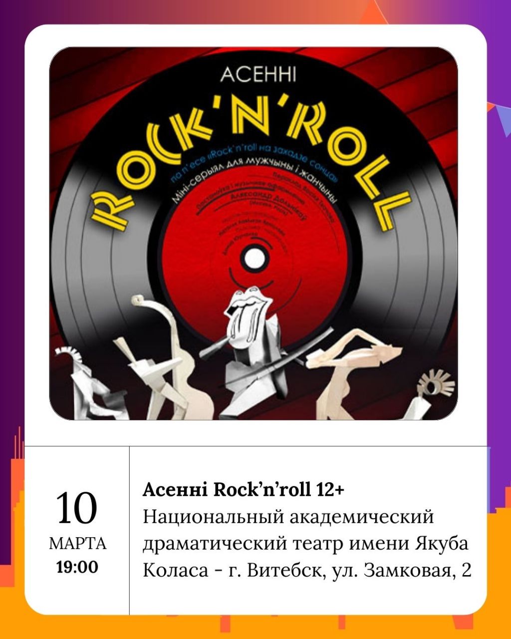 На сцене Национального академического драматического театра имени Якуба Коласа состоится спектакль «Асенні Rock’n’roll» (12+). Этот яркий и динамичный спектакль обещает зарядить зрителей положительными эмоциями и подарить незабываемые впечатления.
