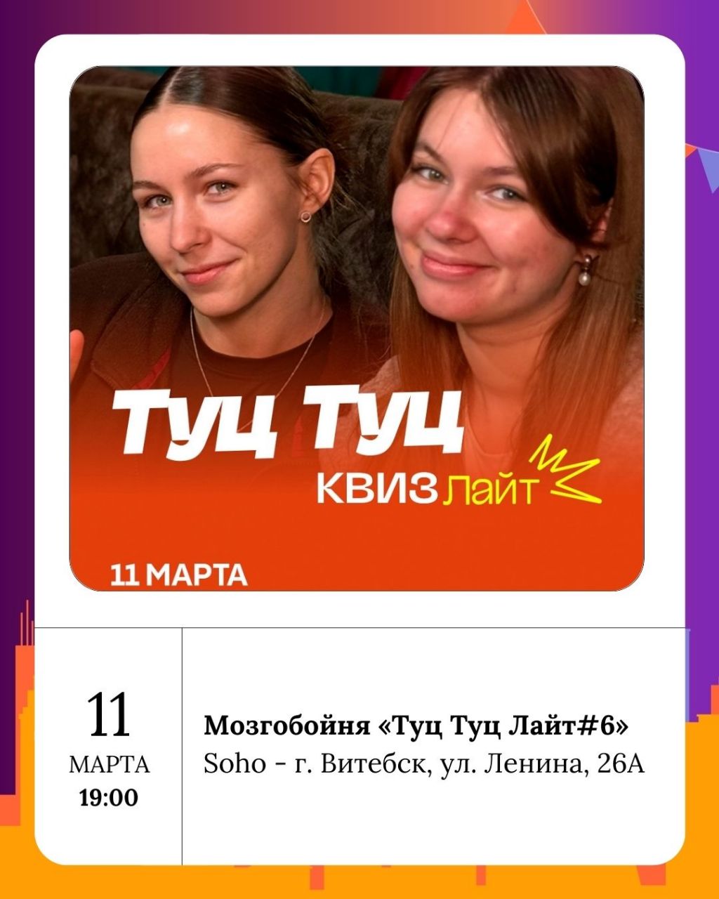 Любителей музыки ждёт игра «Туц Туц Лайт#6». Это лёгкая музыкальная игра, где участники смогут проверить свои музыкальные познания и насладиться атмосферой праздника.