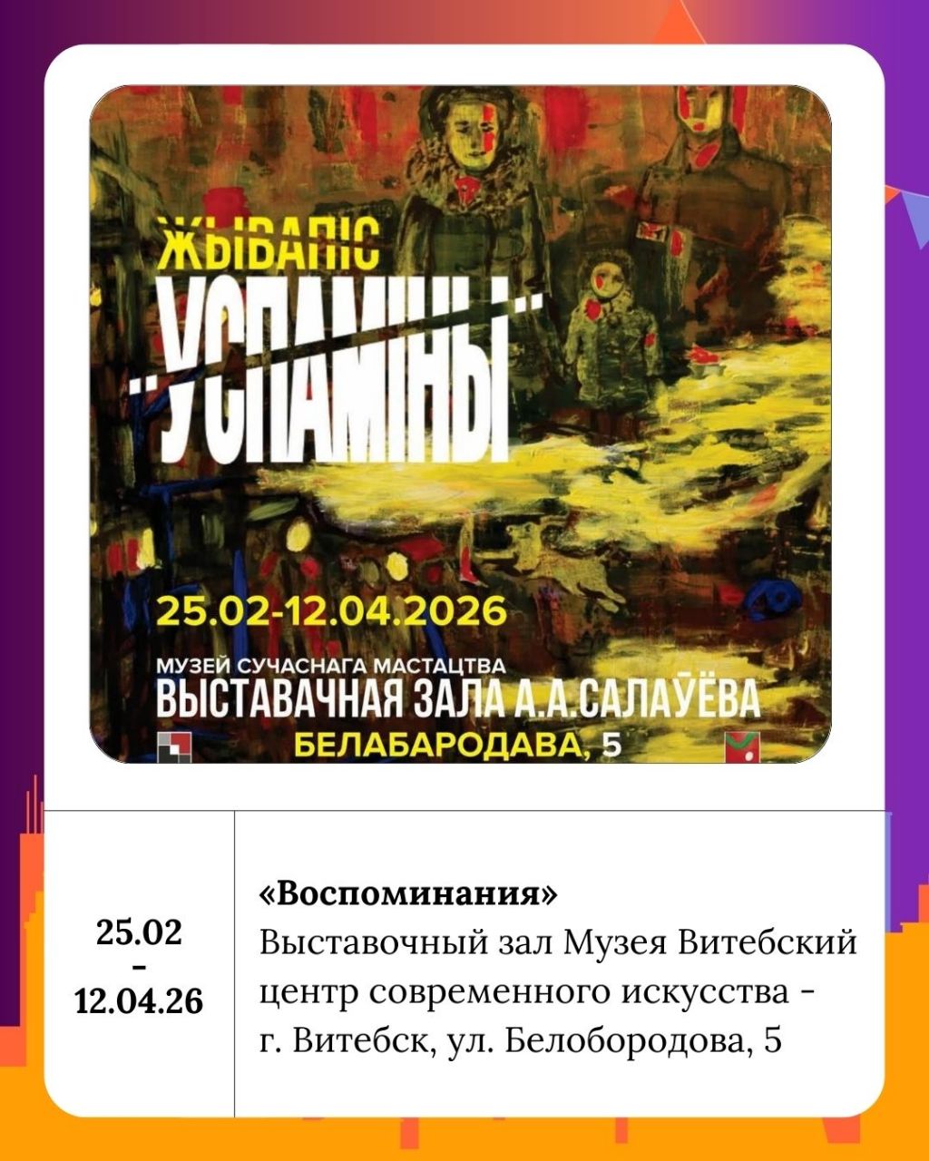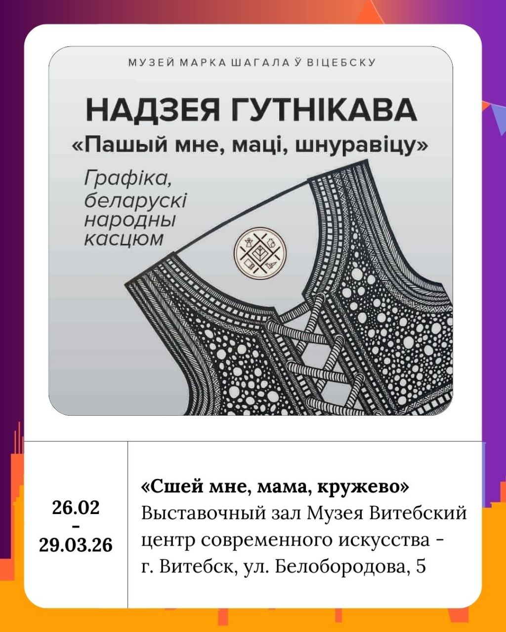 В этот же день можно посетить Витебский центр современного искусства где проходят две интересные выставки: живопись Валентины Ляхович «Воспоминания» и выставка Надежды Гутниковой «Сшей мне, мама, кружево». Первая из них погрузит вас в мир чувств и воспоминаний, а вторая представит удивительные графические работы и белорусские народные костюмы.
