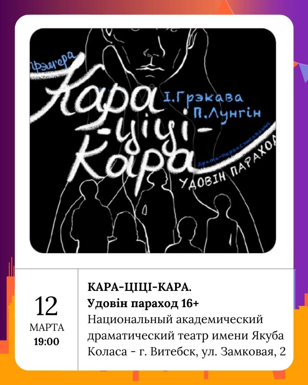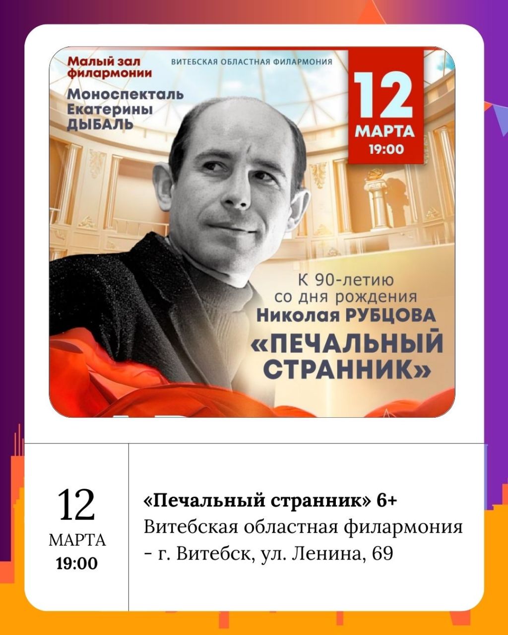 На театральных подмостках продолжится культурная программа. В Национальном академическом драматическом театре имени Якуба Коласа состоится спектакль «КАРА-ЦІЦІ-КАРА. Удовін параход» (16+), который обещает быть не менее увлекательным. Также в Витебской областной филармонии пройдёт моноспектакль «Печальный странник» (6+) - к 90-летию со дня рождения Николая Рубцова . Это мероприятие подарит возможность глубже понять музыкальное искусство и попытку прожить судьбу поэта вместе с ним.