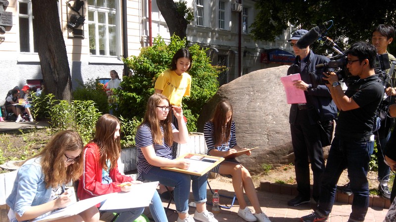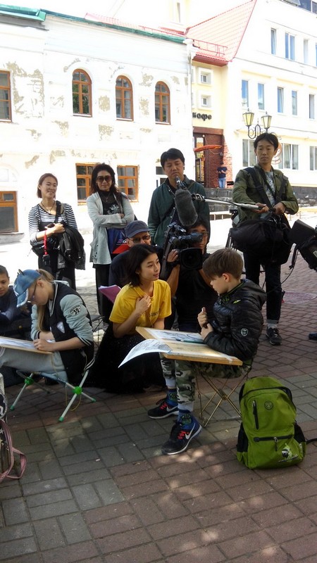 Съемочная группа плодотворно поработала с юными художниками — учащимися Витебской ДХШ, у которых на этой неделе проходит учебный пленэр в сквере возле ратуши. Дети давали интервью, был и момент уникального знакомства — ученица 2-го класса ДХШ Виталина Серегина приветствовала тележурналистов из Токио на японском языке, немало удивив и растрогав гостей. Юная художница начала изучать его, когда увлеклась японской культурой и искусством.