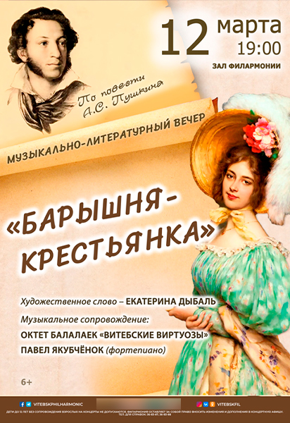 Витебская областная филармония в среду, 12 марта приглашает на моноспектакль Екатерины Дыбаль «Барышня-крестьянка» 6+, а в четверг - на ЦИКЛ ЛЕКЦИЙ-КОНЦЕРТОВ «AD LIBITUM» «ЛАРА ФАБИАН» 6+.