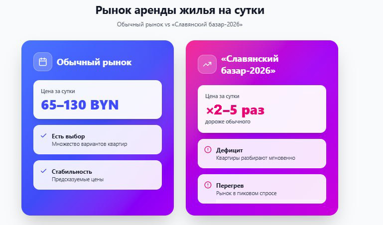 В итоге Витебск на время «Славянского базара» становится другим городом. Тем, где привычные цены теряют смысл, а жильё превращается в дефицитный ресурс. Где 100 рублей превращаются в 500, а наличие свободной квартиры — уже удача.