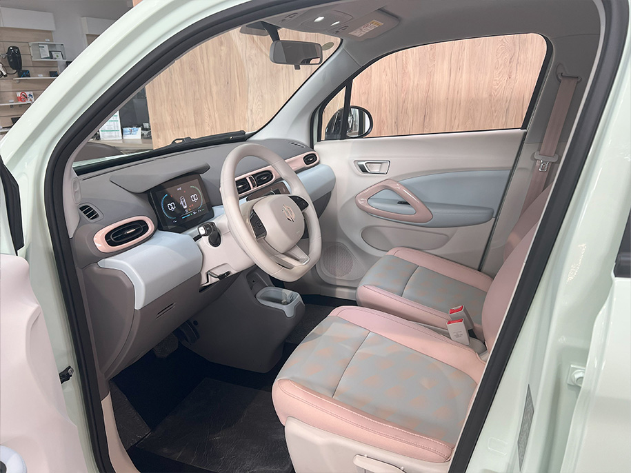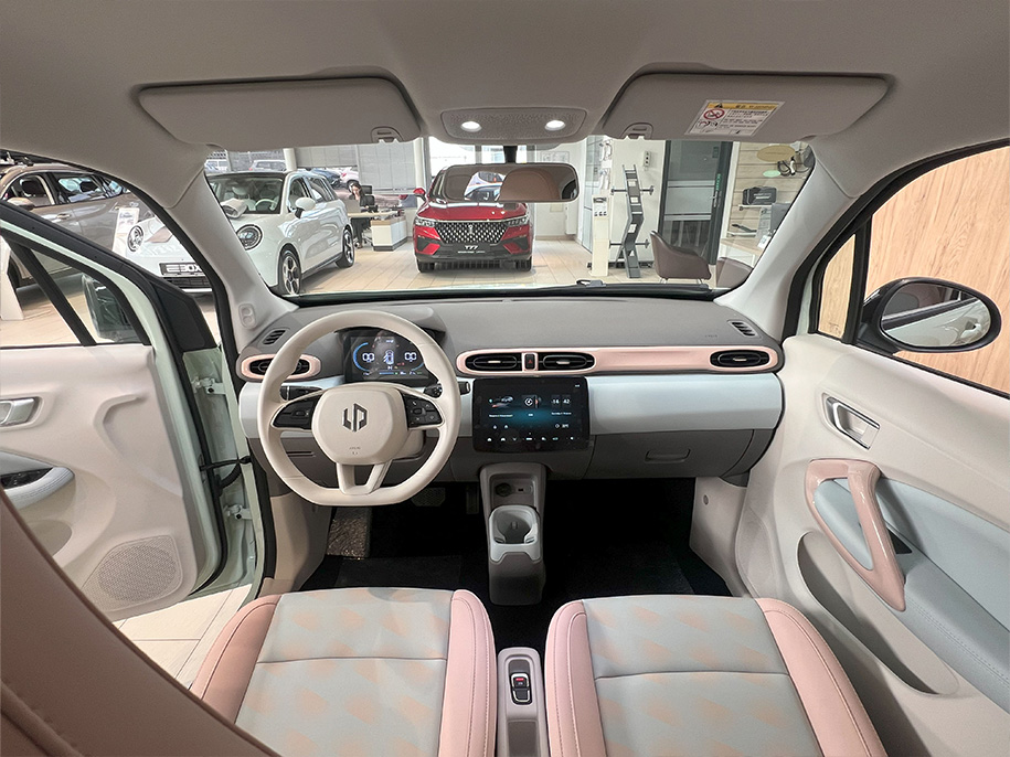 Внутри – 4-местный салон в разных цветах на выбор – в сером или трендовом бежево-розово-голубом цветах. Багажник рассчитан на 210 л, а со сложенными задними сиденьями – на 508 л. Cенсорные экраны, аудиосистема с двумя динамиками, USB-порт и 12-вольтовая розетка для зарядки гаджетов.