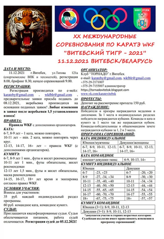Приглашаем вас посетить и поучаствовать в традиционных Международных соревнованиях по каратэ WKF «Витебский тигр – 2021», которые пройдут 11 декабря 2021 г в ВПКиТС (спортивный зал), начало регистрации с 8.00. В этом году соревнования отмечают свой юбилей и пройдут в 20-й раз! Победители и призёры будут награждены медалями и дипломами, чемпионы в индивидуальных разделах будут так же награждены кубками!