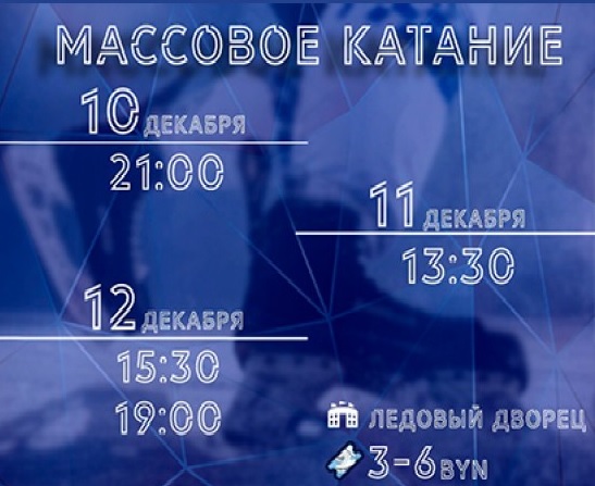 Дворец спорта приглашает любителей активного отдыха на сеансы массового катания! Расписание сеансов на фотографии.