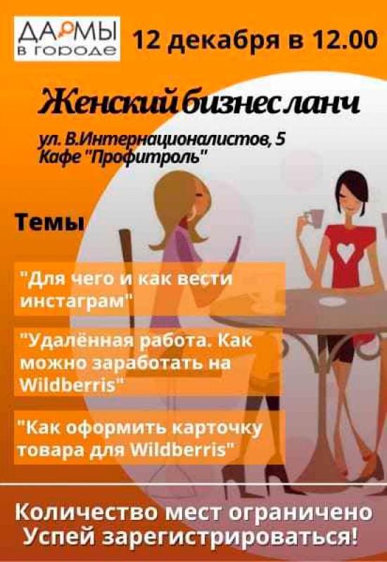 Он пройдёт 12 декабря с 12.00 до 15.00 в кафе "Профитроль". 3 спикера, 2 актуальные и трендовые темы: ведение инстаграм и заработок на Валберис. А также новые знакомства, новое окружение сильных и целеустремнных девушек! Приходи расти и развиваться вместе с нами!