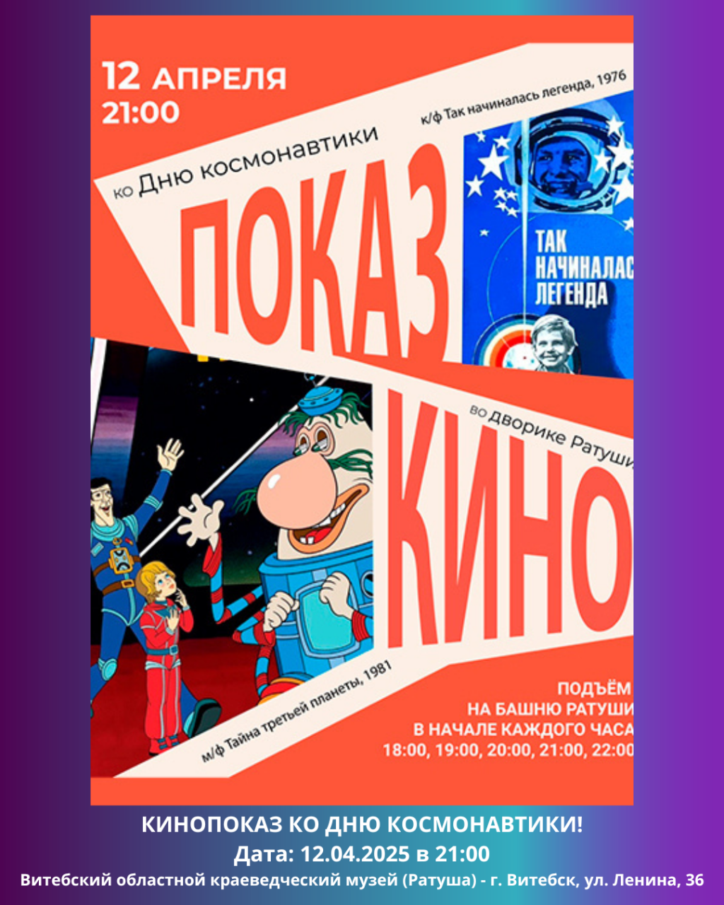 12 апреля - День Космонавтики. И вечером этого дня, в 21.00 во дворике Ратуши покажут м/ф «Тайна третьей планеты», 1981 г. и к/ф «Так начиналась легенда», 1976 г. Вход свободный. С пледами разрешено!