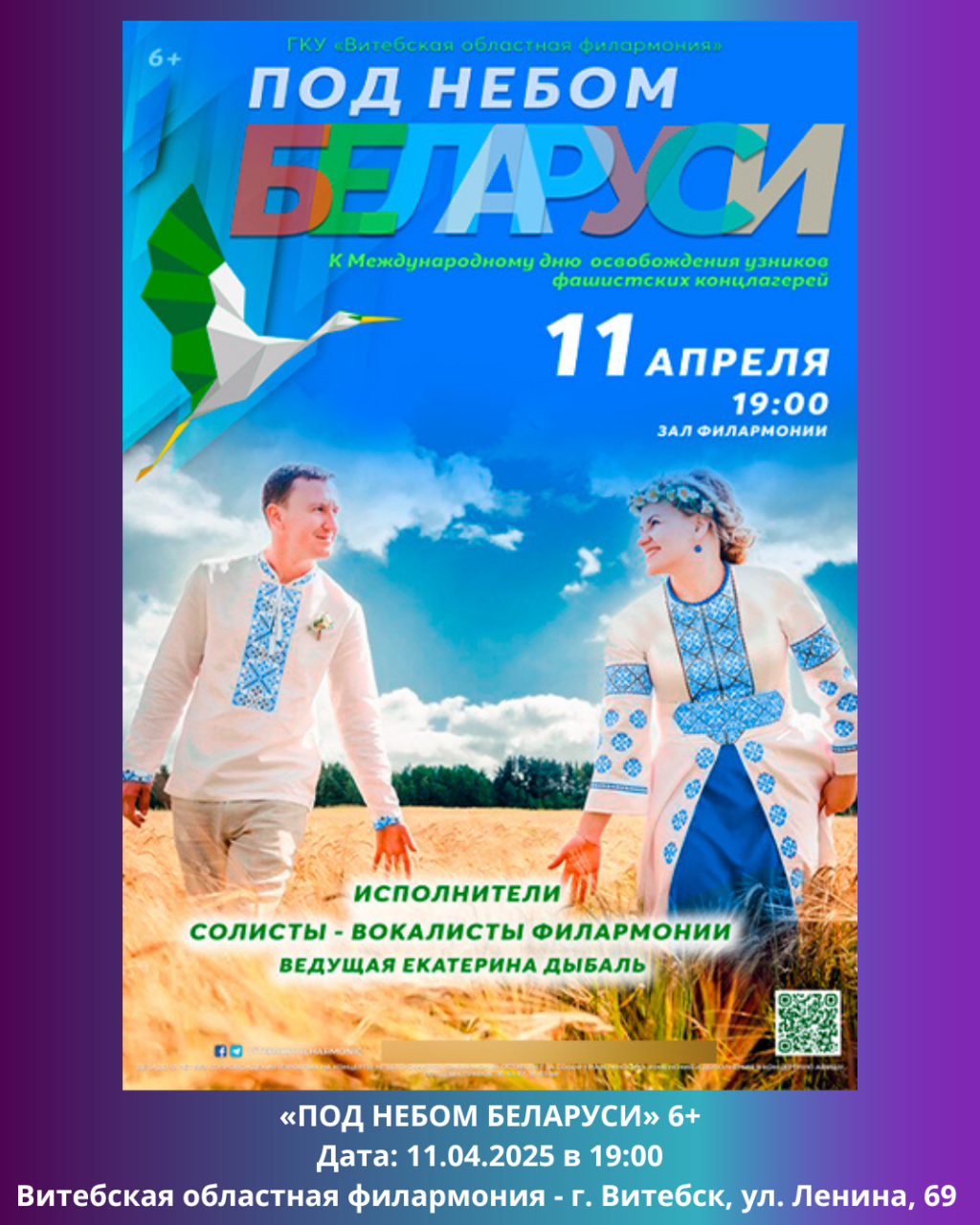 «Под небом Беларуси» 6+ - так называется концерт, который пройдет сегодня в 19.00 в филармонии. Солисты-вокалисты представят программу, наполненную проникновенными песнями о войне, стойкости духа, любви к Родине и надежде на мирное будущее.