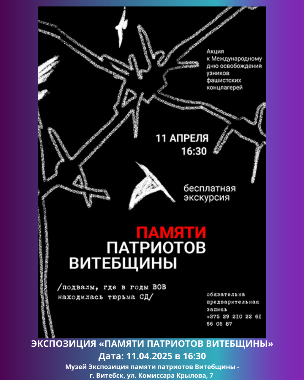 АКЦИЯ к Международному дню освобождения узников фашистских концлагерей! Экспозиция «Памяти патриотов Витебщины» приглашает на бесплатную экскурсию сегодня, 11 апреля, в 16.30 по адресу: ул.Крылова, 7.