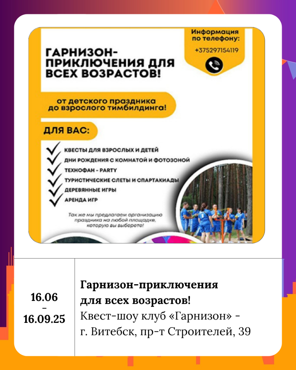 Если любите активные игры, то - Гарнизон - это больше чем активный отдых для детей и взрослых - это настоящее азартное приключение с масштабным реквизитом и уникальным игровым оборудованием!