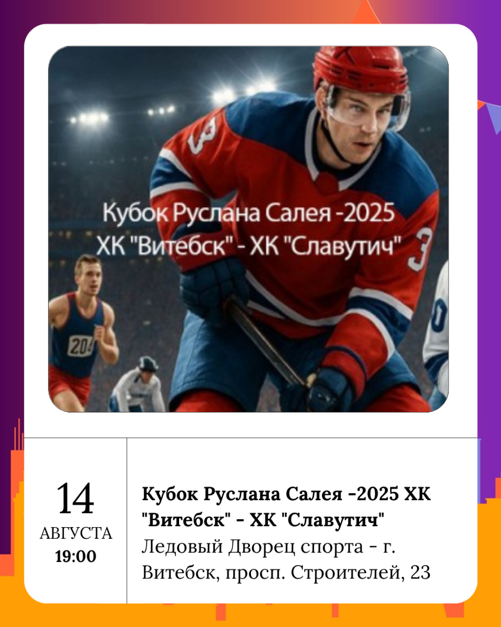 В рамках Кубка Салея в четверг состоится матч ХК «Витебск» против ХК «Славутич». Приходите посмотреть «приграничное дерби» и поддержать любимую команду!