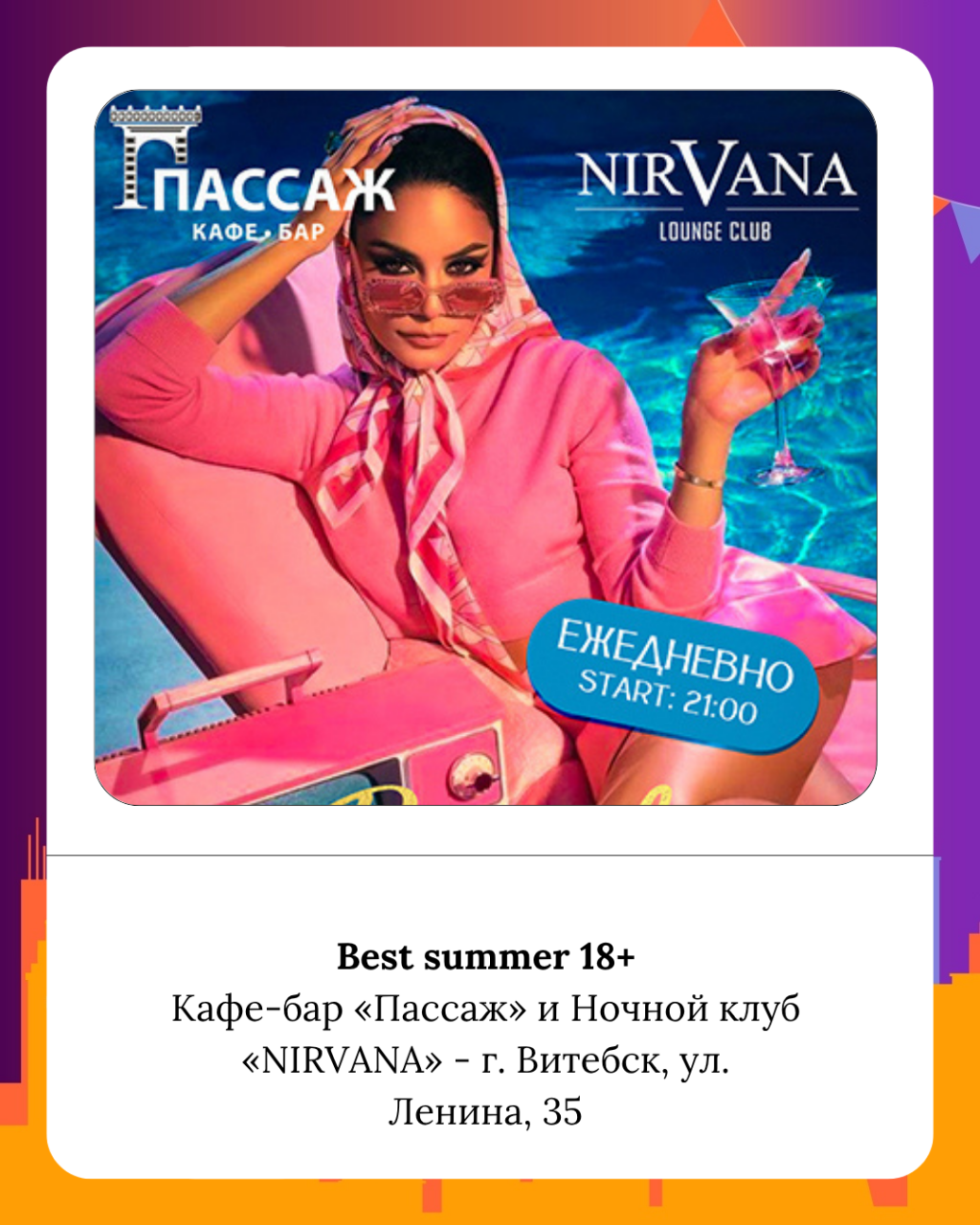 Вечеринки в понедельник? Легко! И во вторник, среду и четверг! Ведь двери Кафе-бара «Пассаж» и Ночного клуба «NIRVANA» открыты и по рабочим дням тоже!