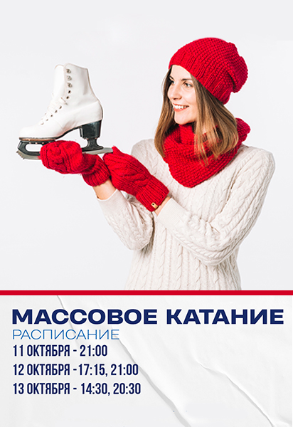 Массовые катания пройдут в ледовом Дворце спорта: 11 октября - 21:00, 12 октября - 17:15; 21:00, 13 октября - 14:30, 20:30.