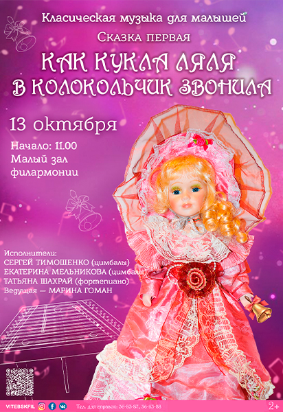 КЛАССИЧЕСКАЯ МУЗЫКА ДЛЯ МАЛЫШЕЙ «КАК КУКЛА ЛЯЛЯ В КОЛОКОЛЬЧИК ЗВОНИЛА» 2+ прозвучит в Витебской областной филармонии в воскресенье в 11.00.