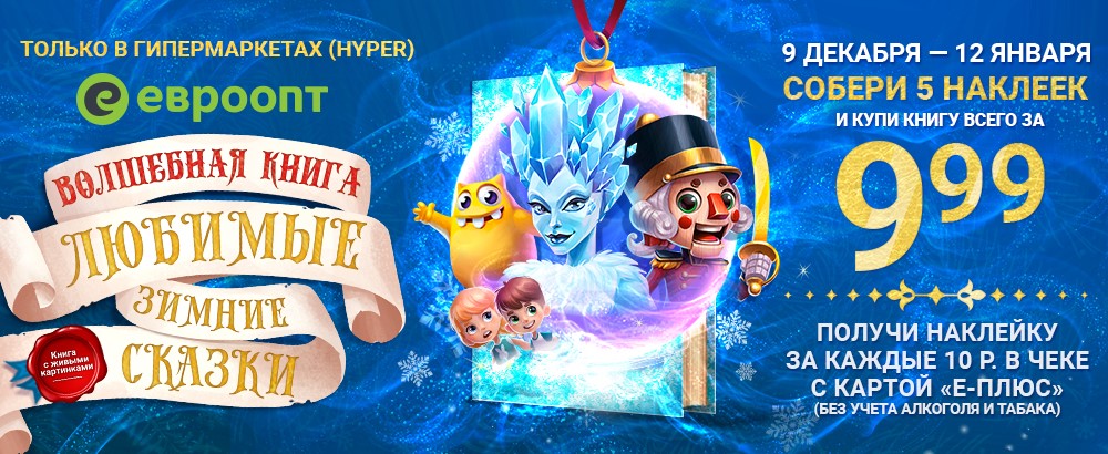 Специально к Новому году «Евроопт» спешит поздравить своих покупателей и предлагает волшебный подарок под елку – уникальный сборник «Любимые зимние сказки» – всего за 9,99 рублей.
