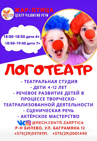ЛогоТеатр Жар-Птица приглашает детей от 4 до 12 лет в новый театральный сезон 2023-2024 год на комплексые занятия 2 раза в неделю: ИНДИВИДУАЛЬНОЕ с логопедом 30 мин. по понедельникам, время согласовывается. ГРУППОВОЕ по четвергам: 18:00 -18:50 дети 4+, 18:50 - 19:40 дети 7+.
