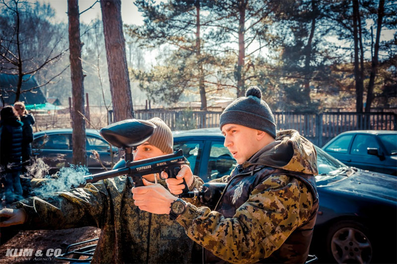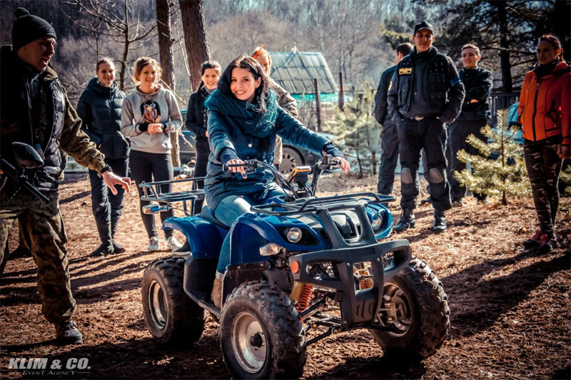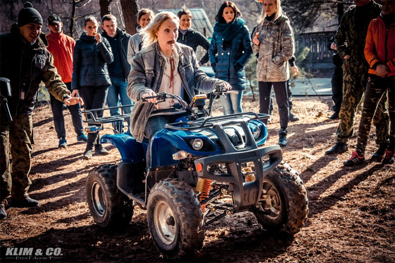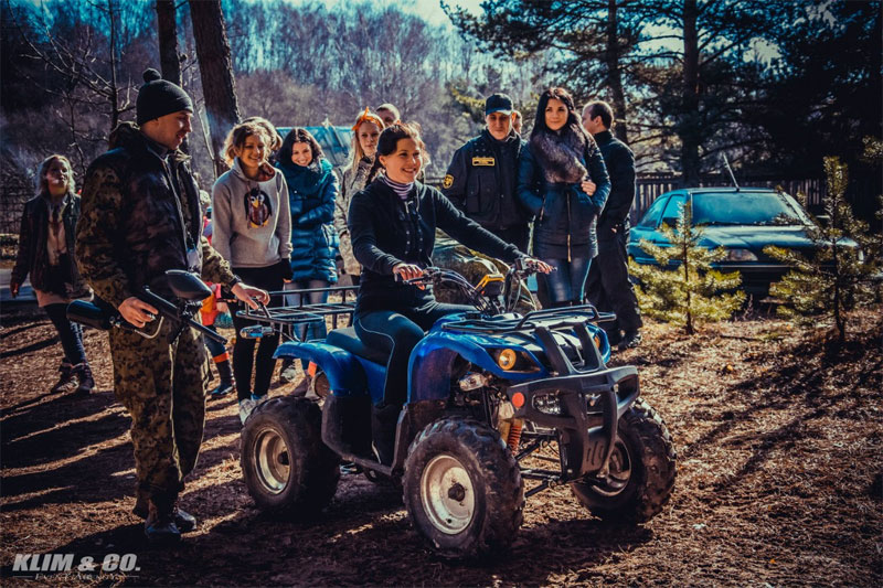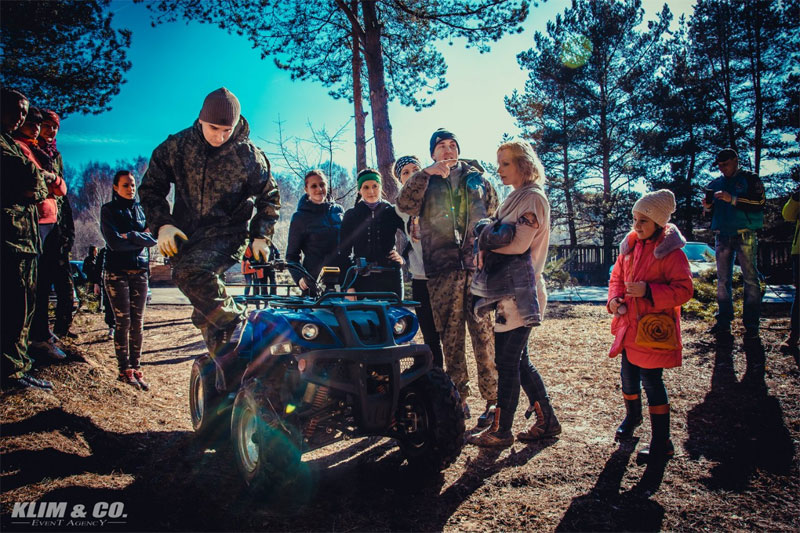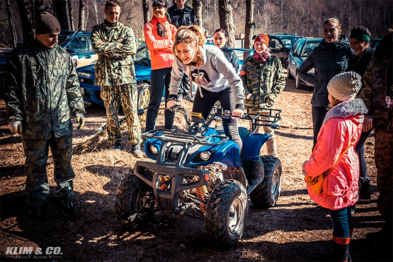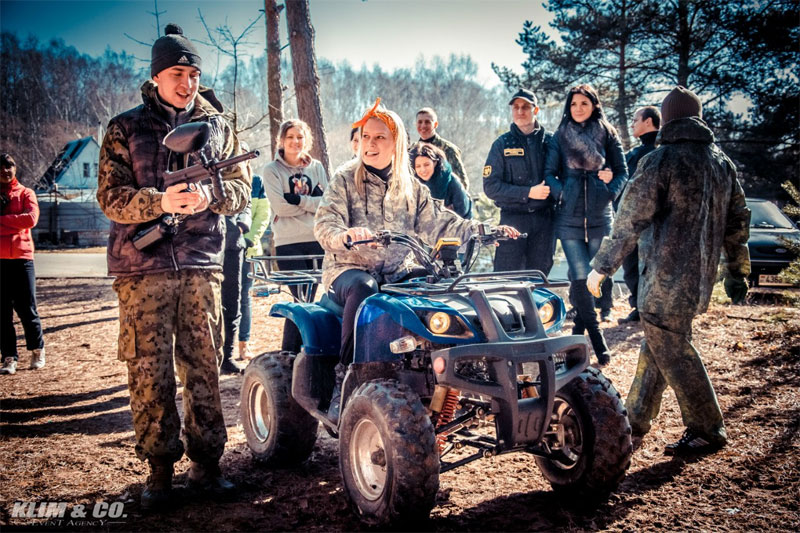 Целое испытание - квадрозабег, а потом еще стрельба из пейнтбольного ружья! Парни же в это время занимались "кухонными делами" - жарили сосиски!