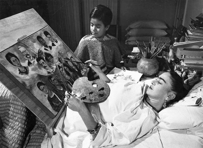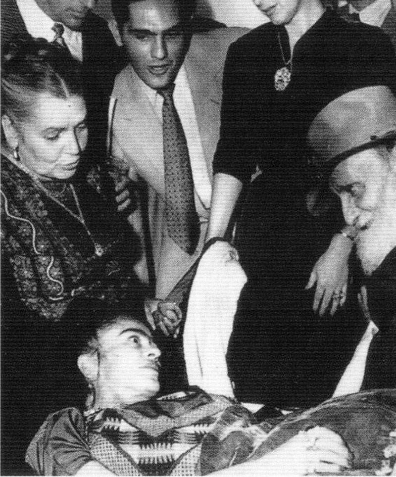 В 1953 году открылась первая персональная выставка Фриды Кало. Из-за болезней муж привез ее в галерею прямо в кровати. Посетители снимали шляпы и аплодировали ее мужеству.