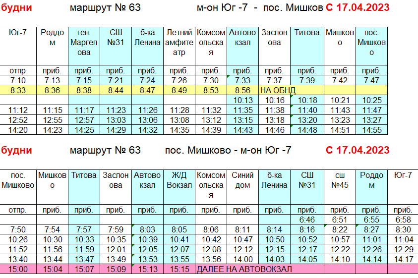 Курсировать автобус будет с 6.46 до 15.15 по будним дням. Среди остановочных пунктов, где будут осуществляться посадка и высадка пассажиров, значатся Юг7, Роддом, Ген.Маргелова, СШ№31, Библиотека Ленина, Летний амфитеатр, Комсомольская, Автовокзал, Заслонова, Титова, Мишково, поселок Мишково.