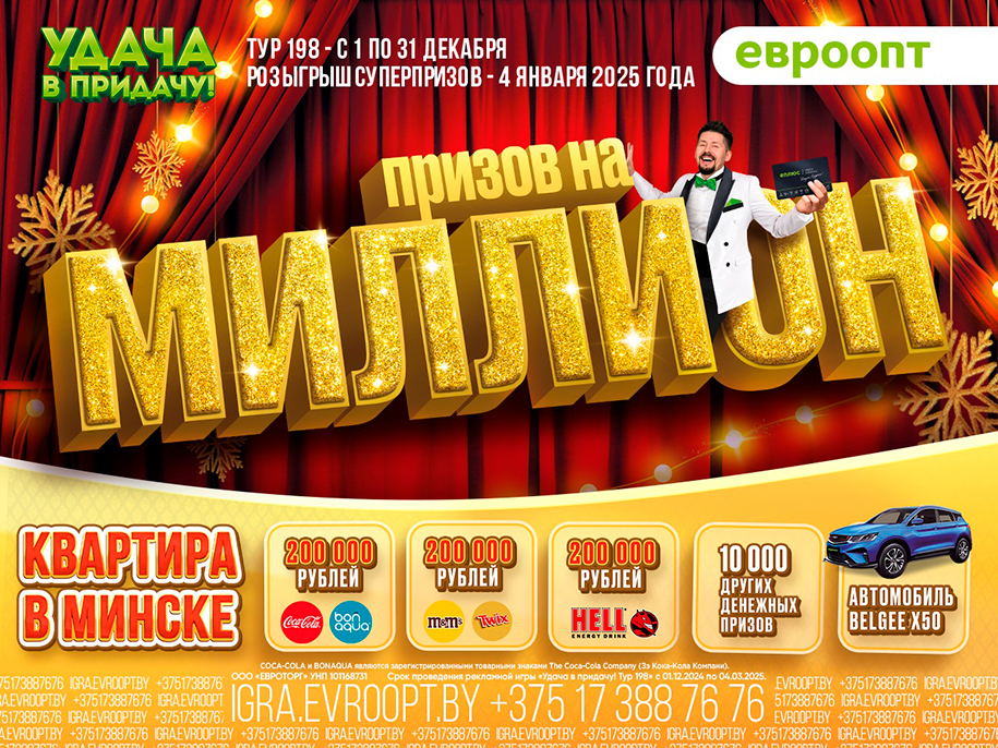 Победителей декабрьского тура определят в прямом эфире 4 января в 18:20. Следить за розыгрышем призов можно на телеканале ОНТ и в YouTube-канале «Евроопта».