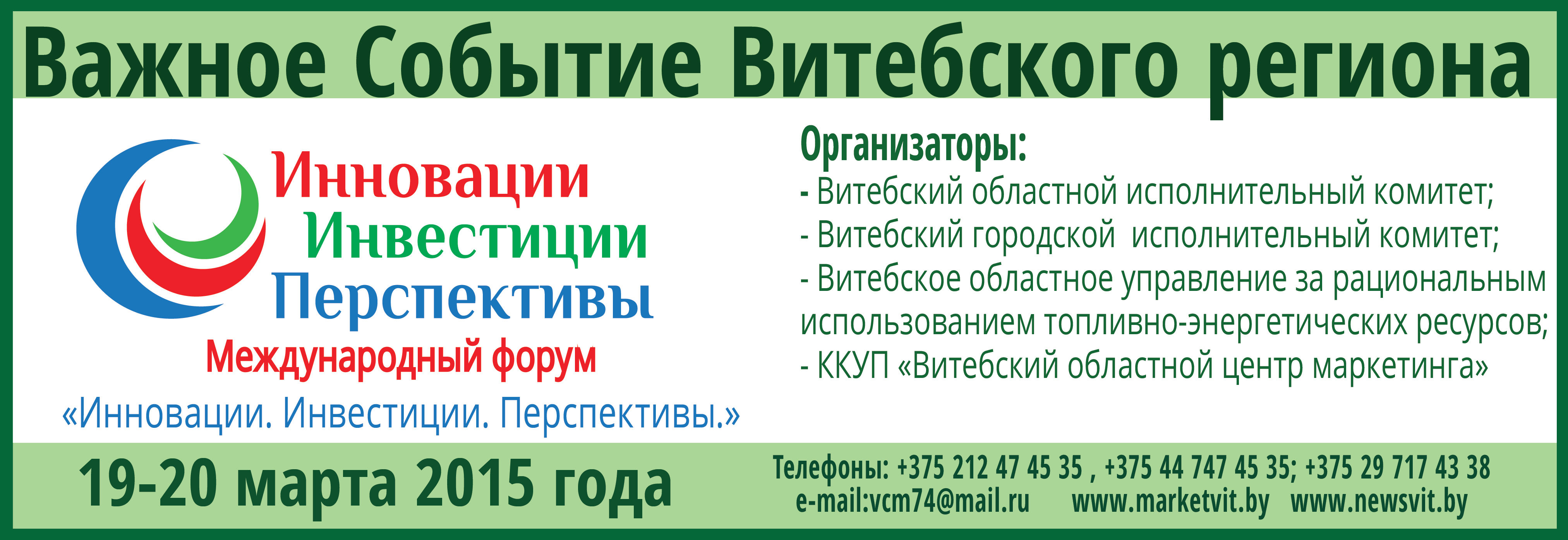 В соответствии с распоряжением Витебского областного исполнительного комитета № 370р от 22.12.2014г. Международный форум ”Инновации. Инвестиции. Перспективы“ (далее – Форум) состоится с 19 по 20 марта 2015 года в г.Витебске в Дворце спорта спортивного учреждения ”Витебский спортивный клуб“ (г.Витебск, пр-т Строителей, д.23).