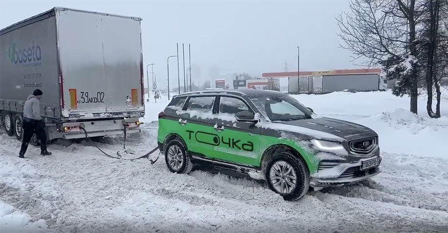 Фура забуксовала на «подстилке» из льда и снега рядом с заправкой у МКАД и метро «Малиновка», загородив дорогу. Пришли на помощь ребята из автоцентра «Точка» напротив. Пристегнули груженую фуру тросом к Belgee X70 – и на удивление кроссовер справился.