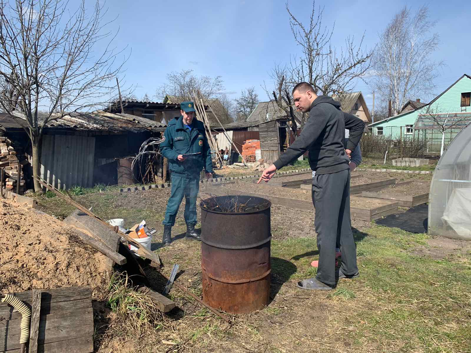 Инспектор провел инструктаж и отправился по следующему адресу. На соседней даче молодая пара тоже наводит дворовую уборку, костер у них не на земле, а в металлической бочке.