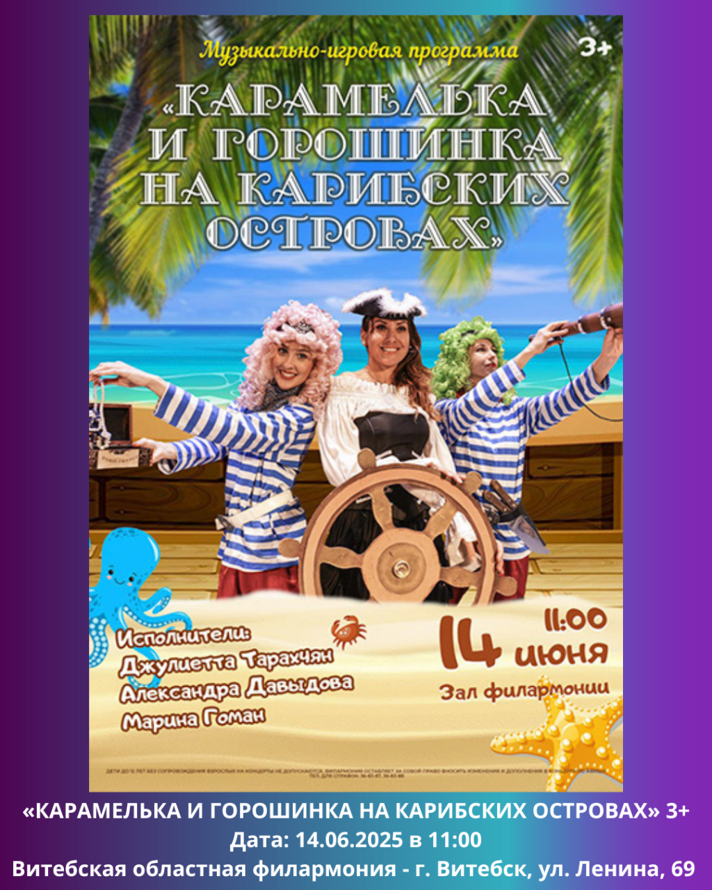 Юные покорители морей! Присоединяйтесь к Карамельке и Горошинке в путешествии на Карибские острова! Отправление из витебской областной филармонии в субботу, в 11.00.