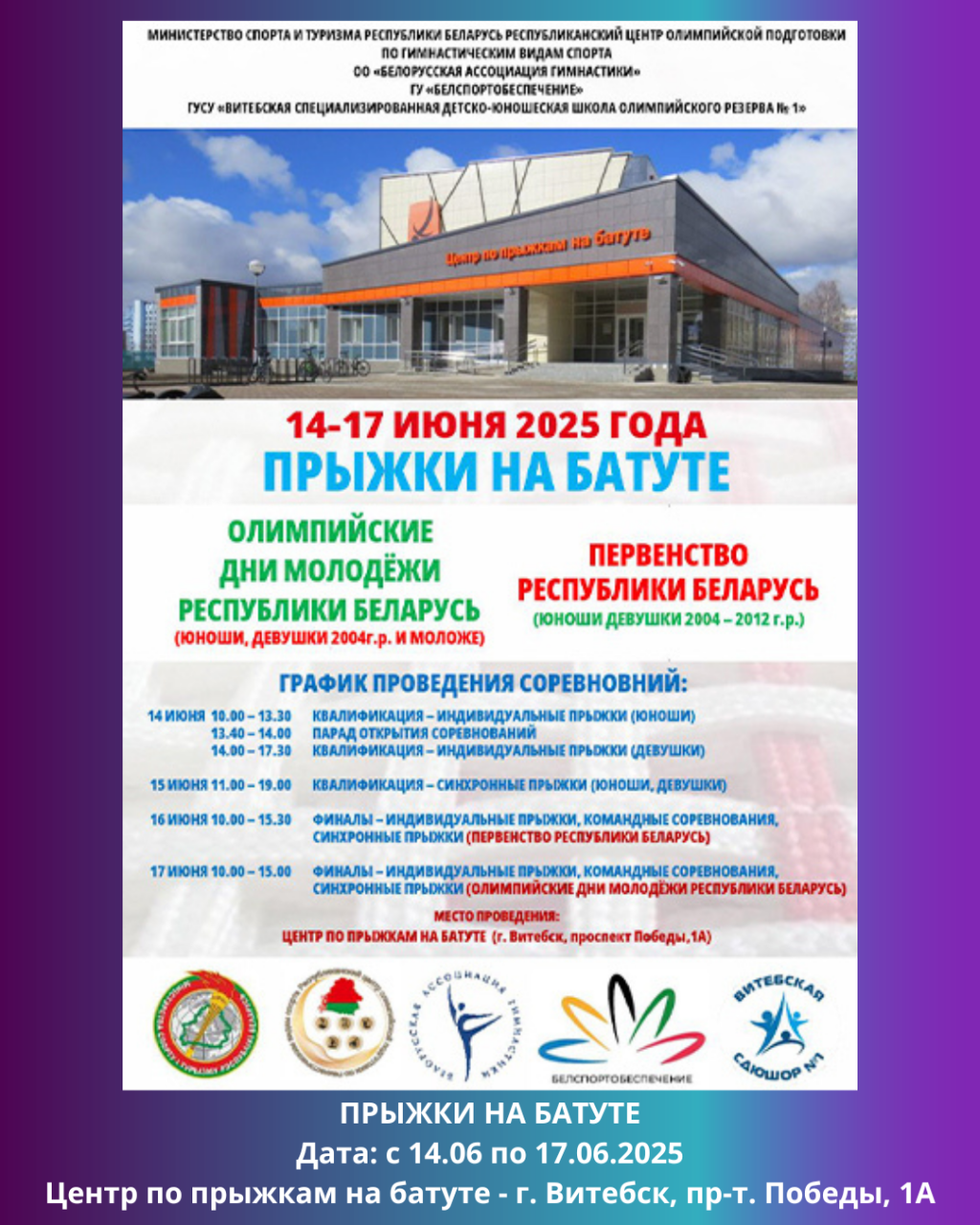 В центре по прыжкам на батуте 14 июня начинается первенство Республики Беларусь по прыжкам на батуте. Приходите болеть за своих фаворитов!