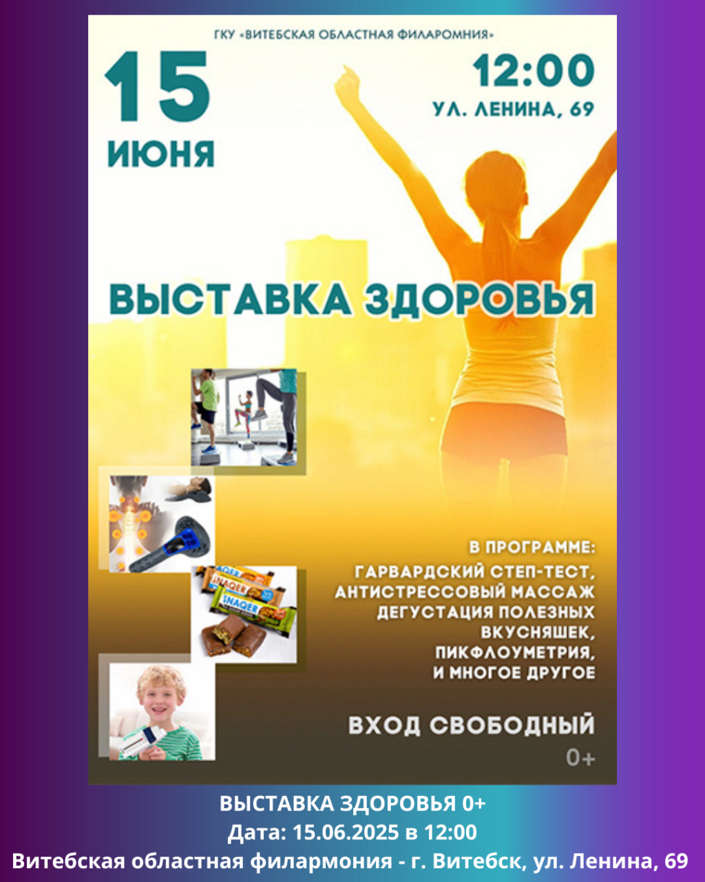 А в филармонии пройдет необычная Выставка здоровья 0+. В программе: дегустация полезных вкусняшек, пикфлоуметрия, Гарвардский степ-тест, антистрессовый массаж и многое другое. Вход свободный.