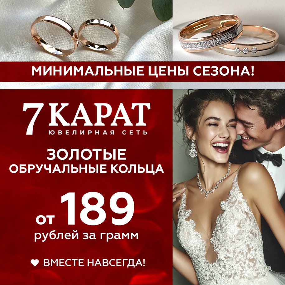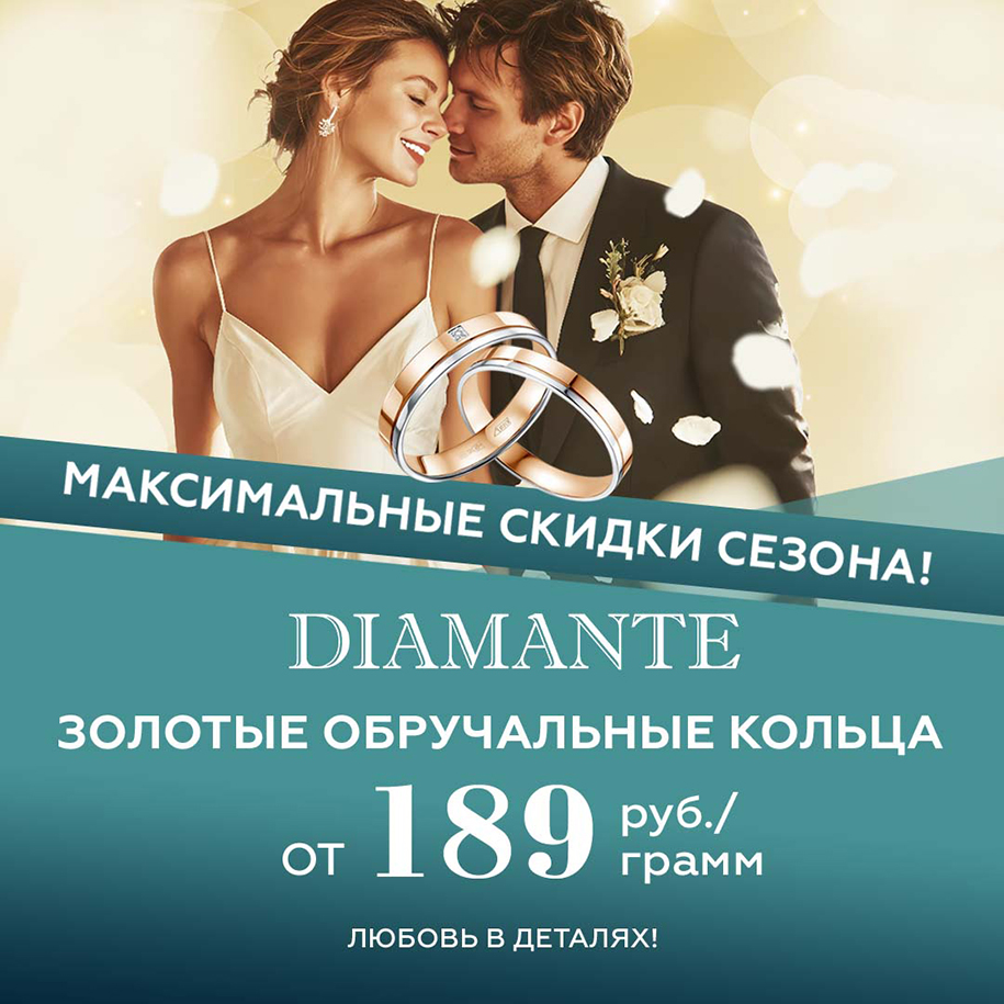 В разгар свадебного сезона ювелирные сети «7 КАРАТ» и DIAMANTE объявили о специальном предложении на золотые обручальные кольца. Цены на украшения стартуют от 189 рублей за грамм. При этом оформить покупку можно как в розничных магазинах по всей стране, так и онлайн — с доставкой на дом.