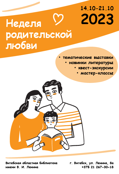 Витебская областная библиотека им. В. И. Ленина с 14 октября проводит неделю родительской любви. С ее программой можно ознакомиться здесь >>>