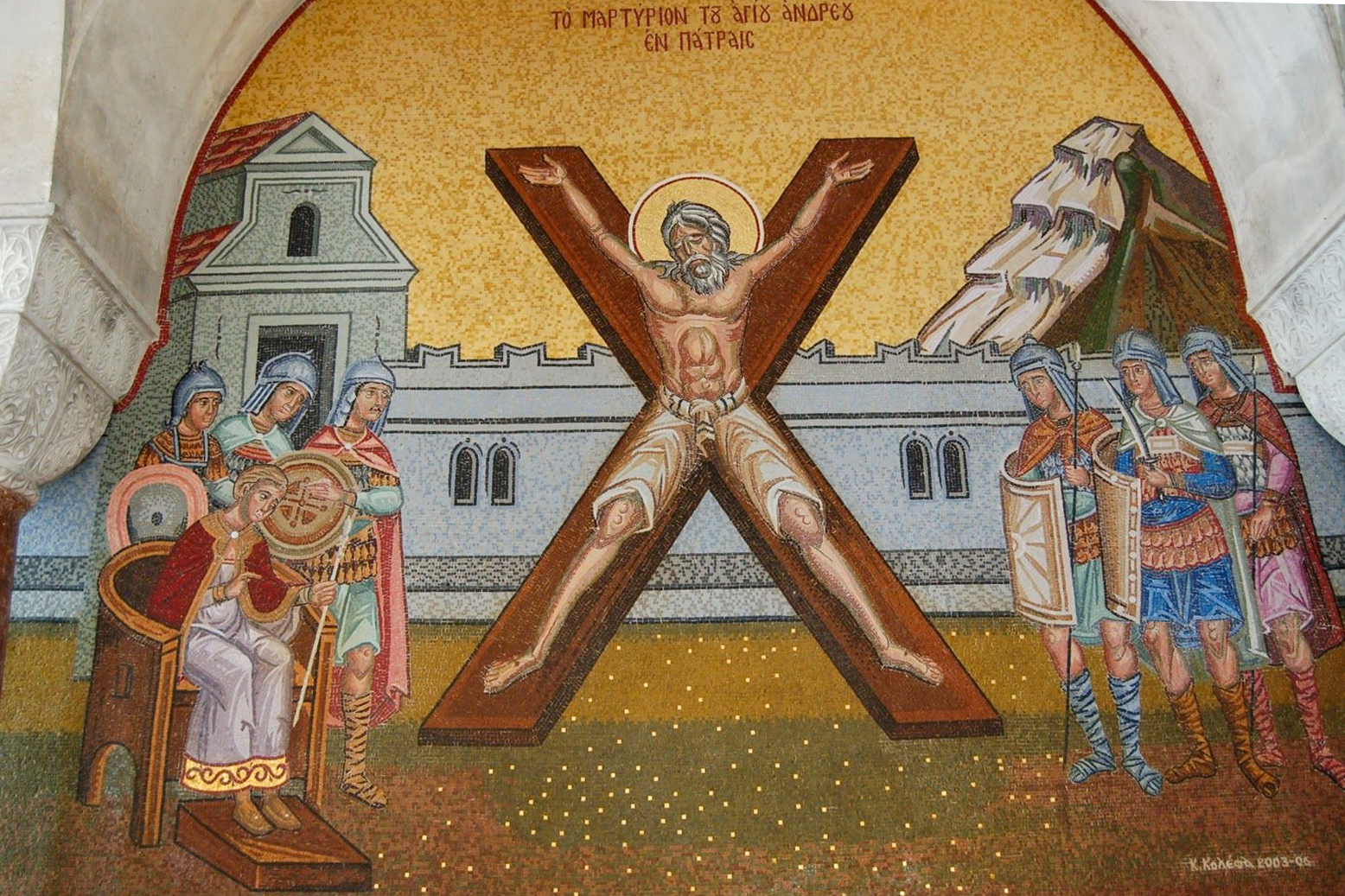 Около 70 года апостол Андрей принял мученическую смерть в городе Патры. Святого распяли на Х-образном кресте, который с тех пор называется Андреевским. Считается, что форму креста для распятия в виде буквы «Х» апостол Андрей выбрал сам, полагая, что он недостоин быть распят на кресте той же формы, что и Спаситель.