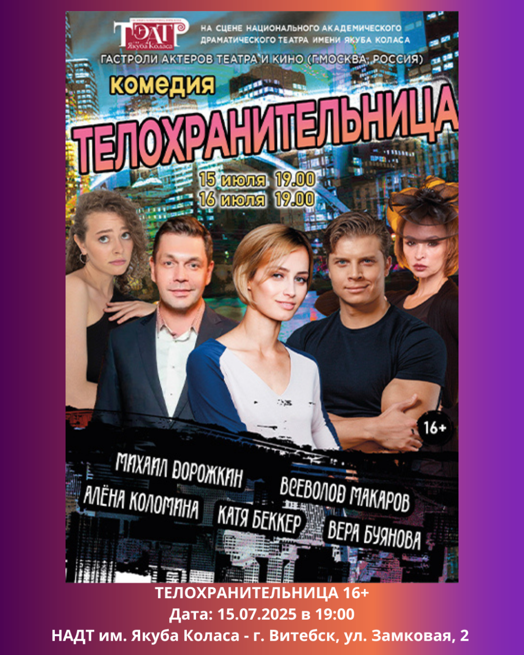 Национальный академический драматический театр имени Якуба Коласа во вторник и в среду приглашает на спектакль Телохранительница 16+ с участием российских актеров Михаила Ворожкина, Всеволода Макарова, Алены Коломиной, Кати Беккер и Веры Буяновой, а в четверг - на Гамлет 16+.