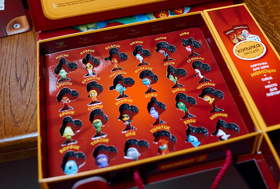Для хранения коллекции предназначен чемодан эмоций. В него входят альбом с персональными ячейками для персонажей и две настолки – игра-бродилка и «Мемоции». В отличие от «Мемо», в ней нужно не только составлять пары, но и изображать разные эмоции. В игре присутствуют разные сценарии и суперрежимы, в том числе «Карусель», «Папа спит!» и «Молния».