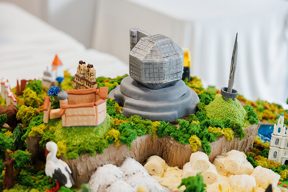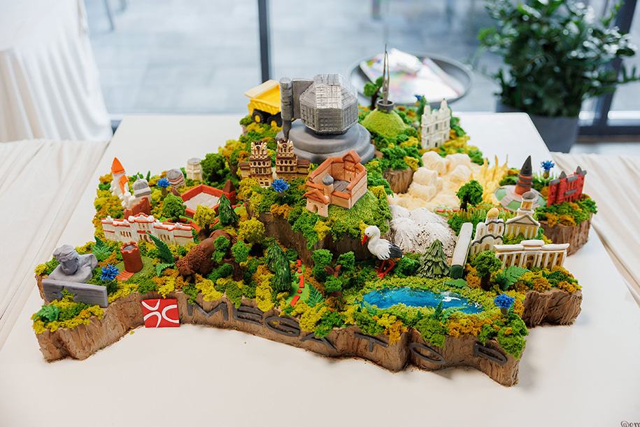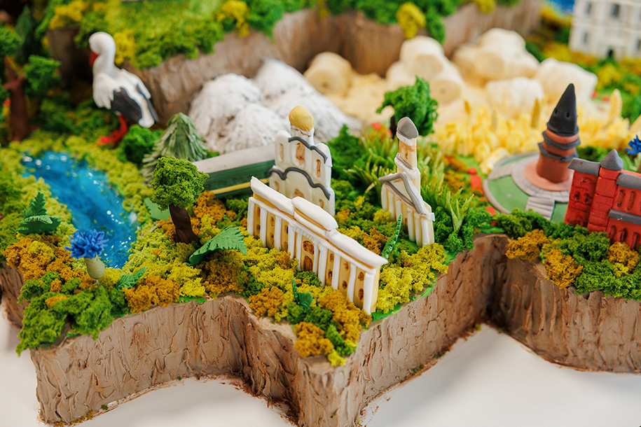 Декор торта выполнен вручную и воссоздает знаковые достопримечательности и символы каждого региона: от Национальной библиотеки и Брестской крепости до карьерных самосвалов, Беловежской пущи, аистов и зубров.