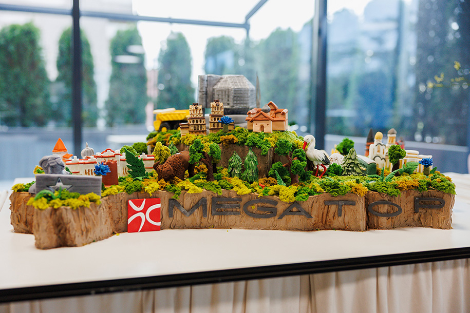 Группа компаний Megatop создала метровый торт-шедевр в виде детальной карты Беларуси. На нем нашли отражение символы страны, в том числе зубры, аисты и карьерные самосвалы. В процессе использованы элементы молекулярной кухни.