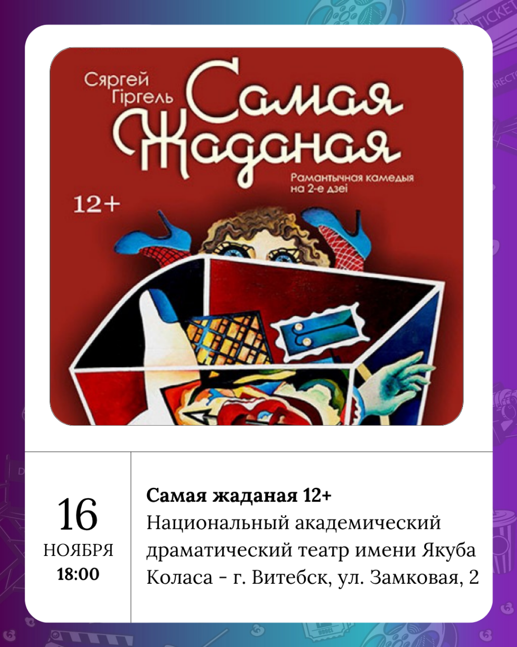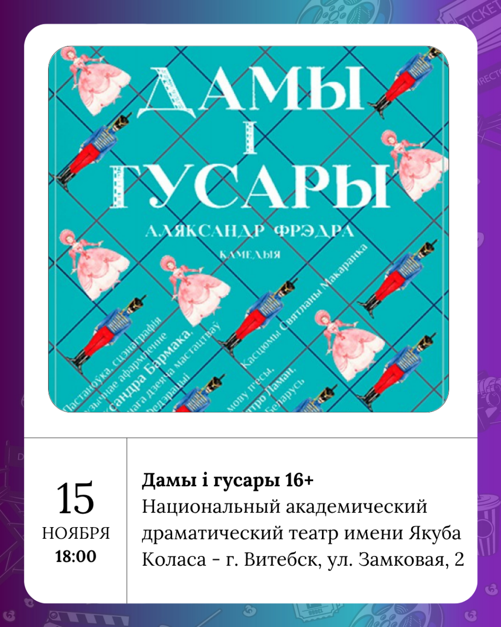 В национальном академическом драматическом театре имени Якуба Коласа в субботу покажут постановку Дамы і гусары 16+, а в воскресенье - Самая жаданая 12+.