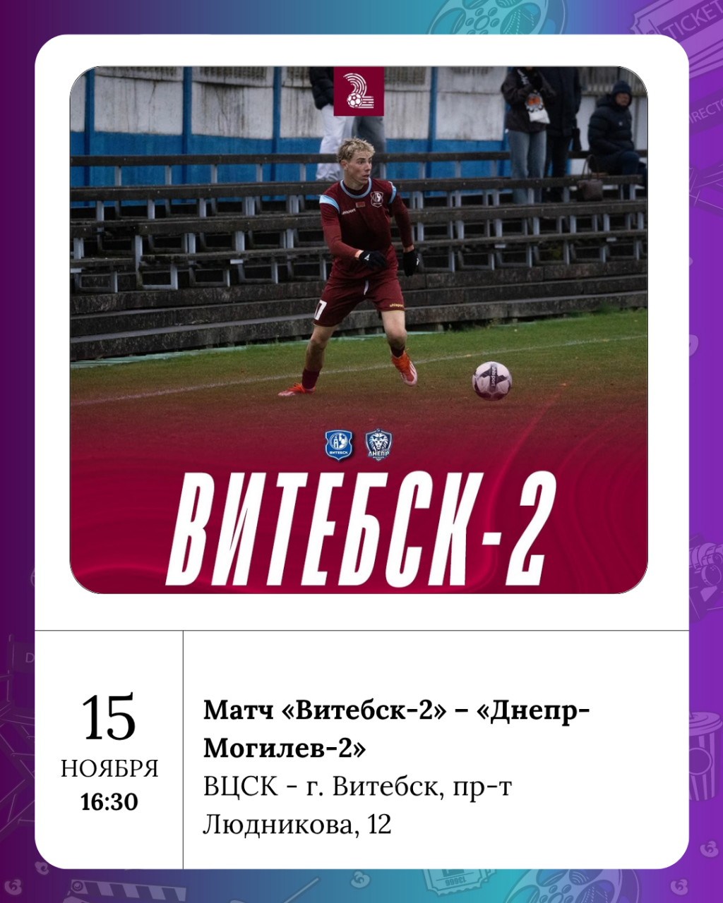 «Витебск-2» сыграет с «Днепр-Могилев-2» 15 ноября в центральном спортивном комплексе ФК "Витебск". Болеем за наших!