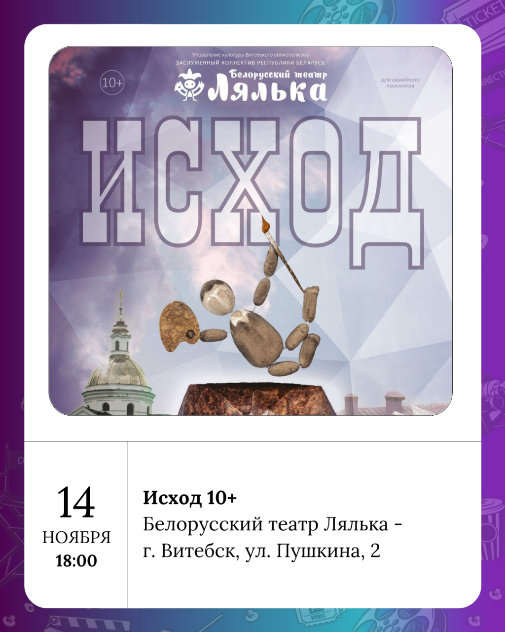 Белорусский театр Лялька приглашает на спектакль Исход 10+ сегодня, завтра - на Фіндус 5+ и Теремок 2+, а в воскресенье - на Пятрушка 5+ и Девочка и медведь 3+.