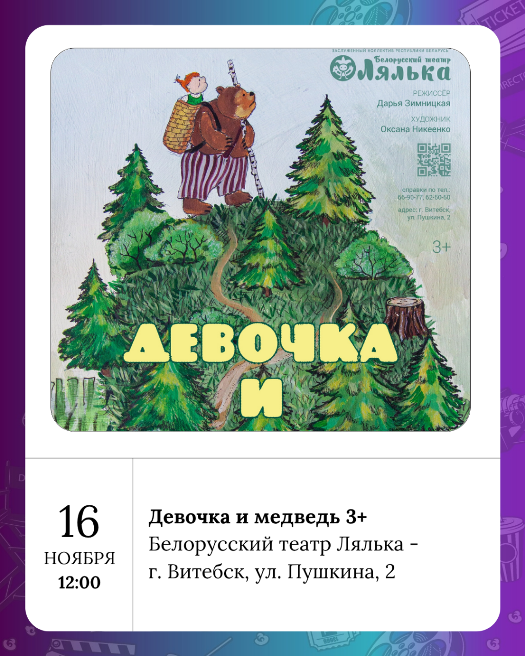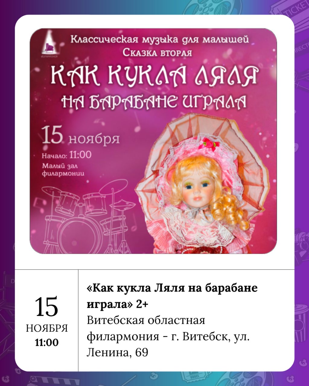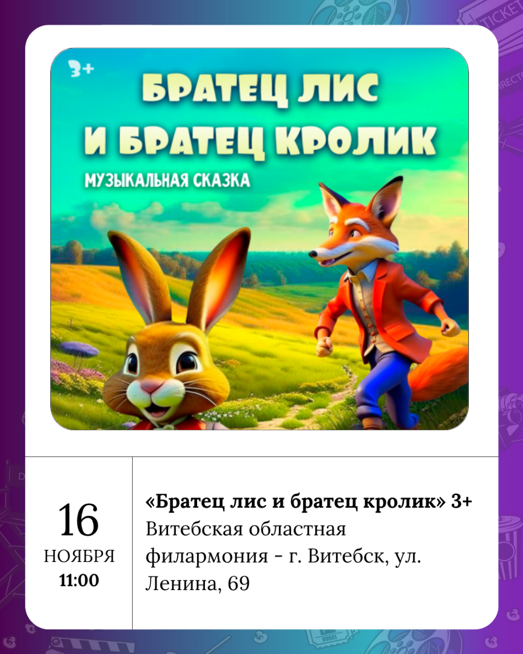 Витебская областная филармония ждет деток на сказку «Как кукла Ляля на барабане играла» 2+ в субботу, а в воскресенье на «Братец лис и братец кролик» 3+.