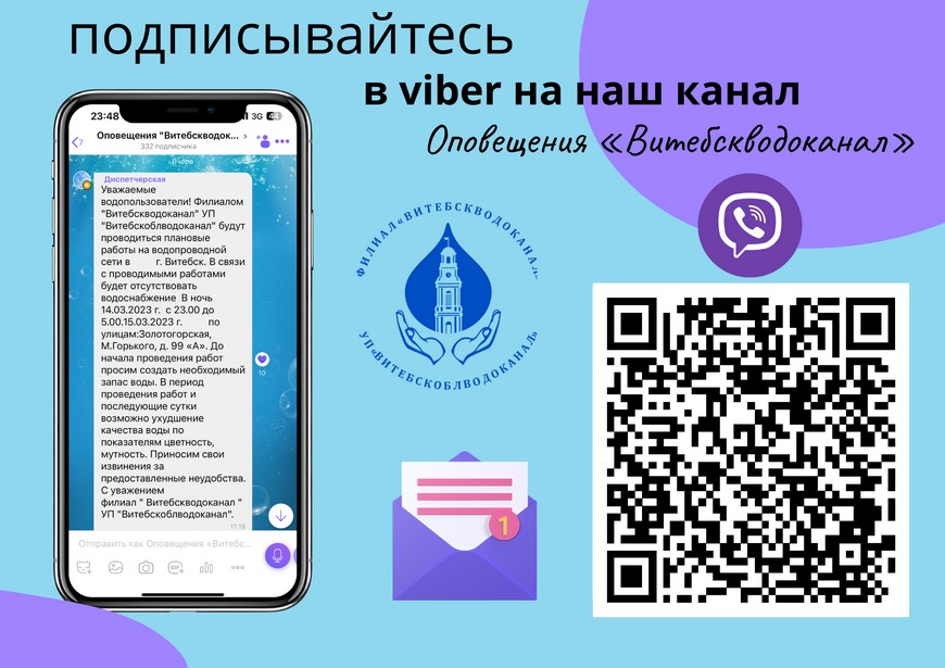 Подписывайтесь на канал «Оповещения «Витебскводоканал» и будьте в курсе о проводимых плановых и ремонтных работах, технических мероприятиях на объектах водоснабжения и водоотведения, а также остальных вопросах, касающихся водоснабжения и канализации.