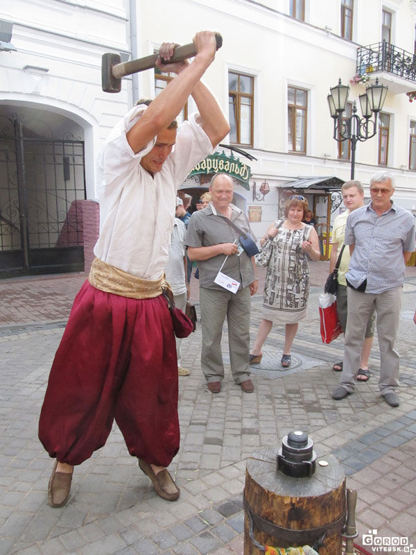 Разумеется, речь не о настоящих деньгах, а о сувенирных пятаках. Алюминиевые и латунные монеты на глазах у публики чеканят мастера Гетманского монетного двора. На нынешнем фестивале они стали гвоздем программы и в «Городе мастеров», и на «Задзвінскім кірмашы».