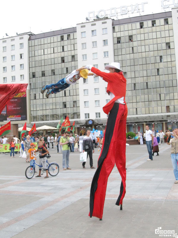Особенно привлекали ряженые артисты-великаны на ходулях: они то пританцовывали, то раскачивали детей за руки в воздухе, то в баскетбол играли.
