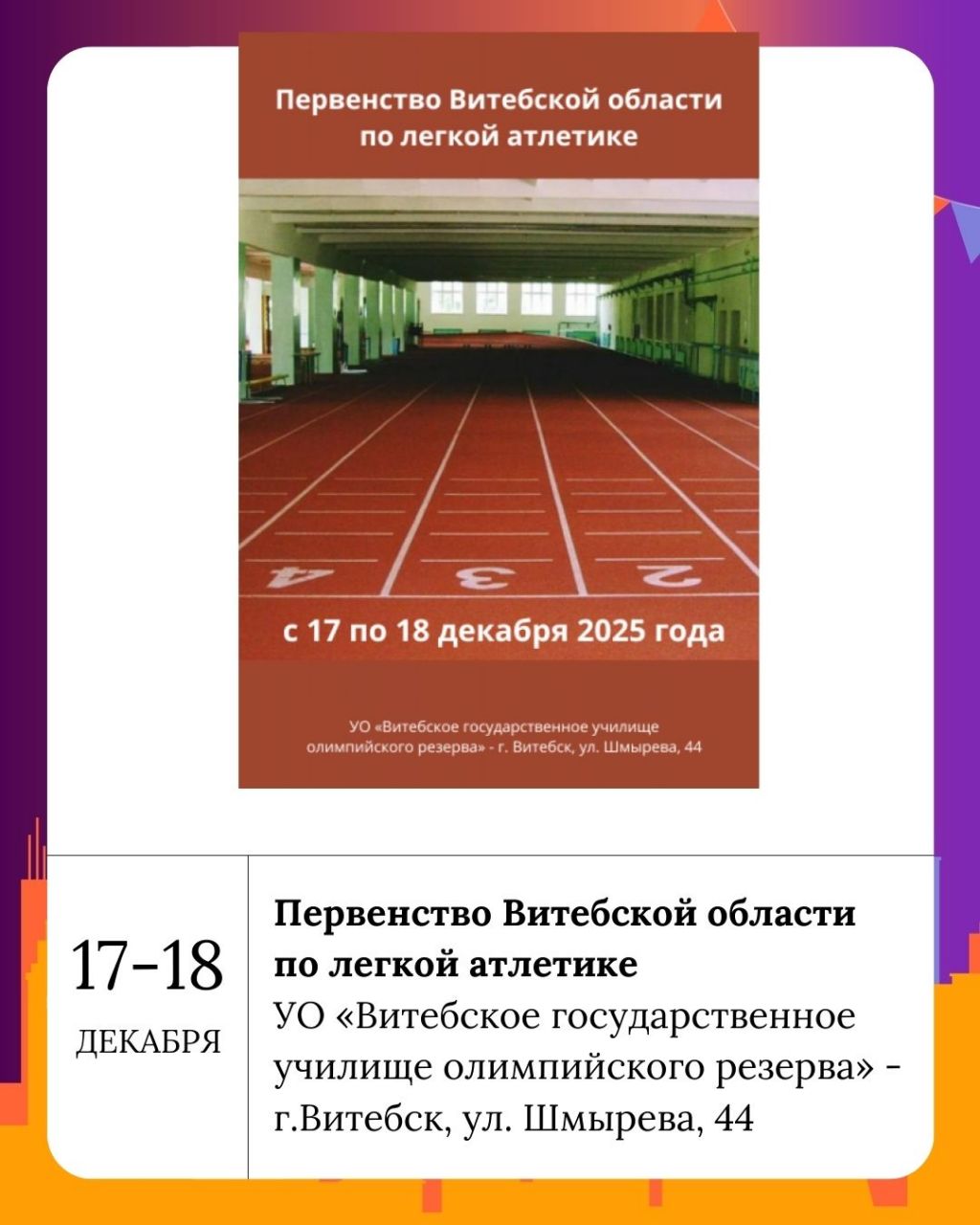 В период с 17 по 18 декабря в г.Витебске на базе УО "Витебское государственное училище олимпийского резерва" состоится первенство Витебской области по легкой атлетике в помещении среди юношей и девушек 2011-2012 годов рождения.