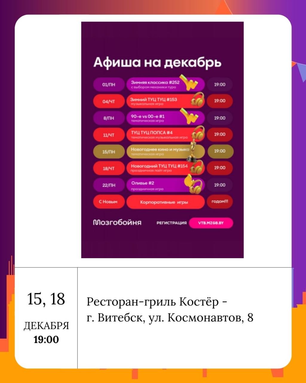 Мозгобойня продолжает этот марафон. Сегодня ребята приглашают на вечер «Новогоднее кино и музыка» — отличный способ погрузиться в атмосферу праздника. А в четверг - Новогодний Туц Туц Квиз #154 — лёгкая и яркая праздничная игра для профи и новичков.