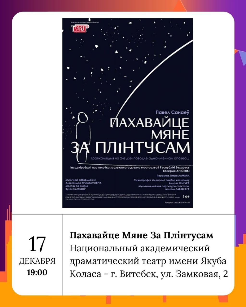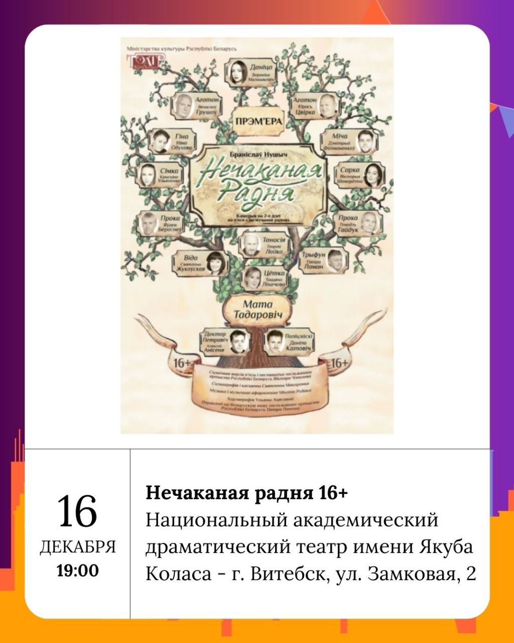 Национальный академический драматический театр имени Якуба Коласа приглашает на спектакль Нечаканая радня 16+ во вторник, а в среду - на Пахавайце Мяне За Плінтусам 16+, где зрителей ждут сильные эмоции и яркая игра актёров.