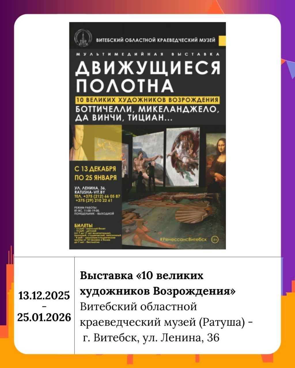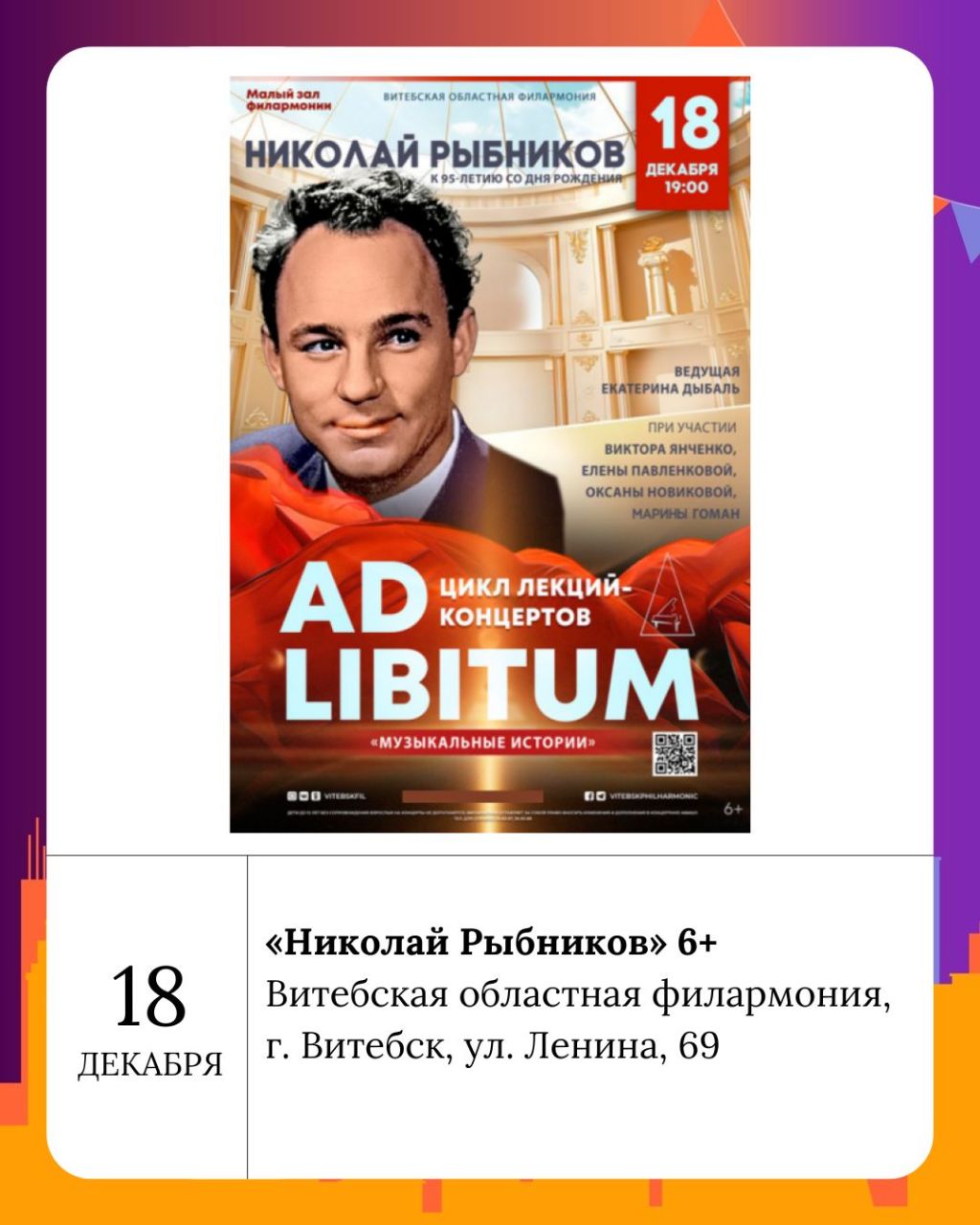 Понедельник в середине декабря уже не кажется таким суровым, ведь до Нового года остаётся всего пара недель! Витебск постепенно превращается в праздничную открытку: витрины сияют огнями, а настроение горожан всё чаще окрашено ожиданием чудес. И даже если утро началось с привычной чашки кофе и мыслей о рабочих задачах, впереди — целая неделя культурных событий, которые помогут зарядиться радостью и вдохновением.