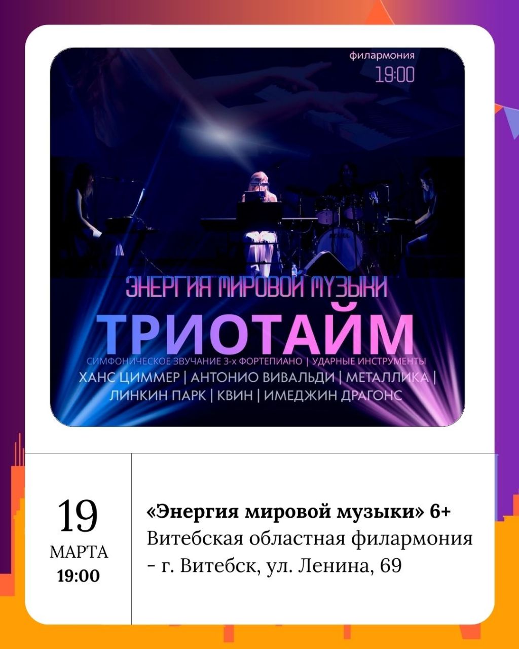 А для ценителей музыки Витебская областная филармония подготовила концерт «Энергия мировой музыки» (6+), который подарит заряд позитива и познакомит с разнообразными музыкальными жанрами.